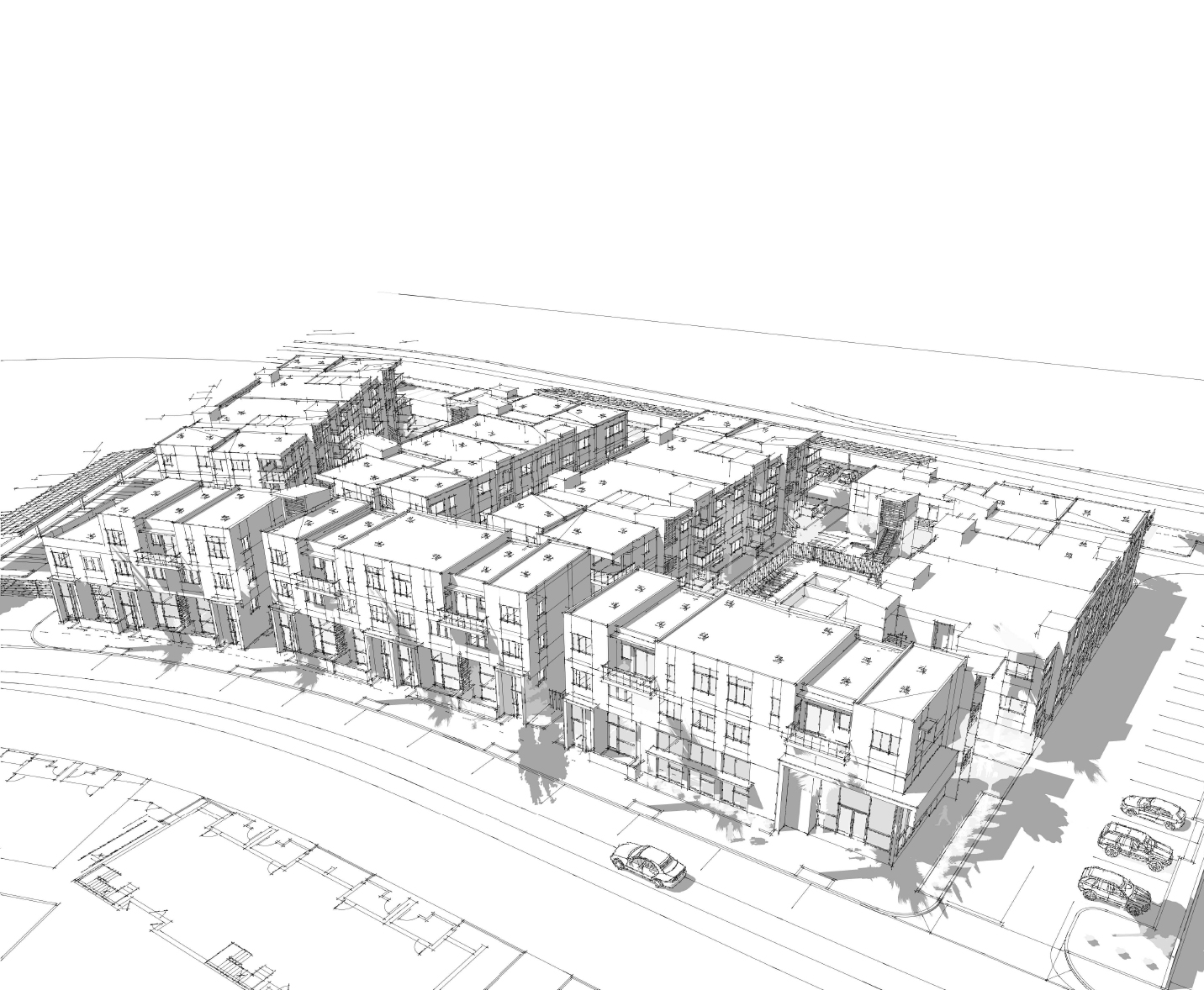 This project has createed a community that has brought more density to the area that Dalygroup is helping to move from strictly agricultural and low density housing to a more mixed community. The project, 78 units, is larger that its previous iteration and contains a series of courtyards divided by a bar-like massing. The materials continue the tri colored play of material between the stucco, the glass, and the metal.