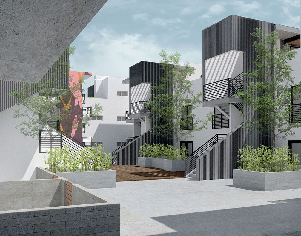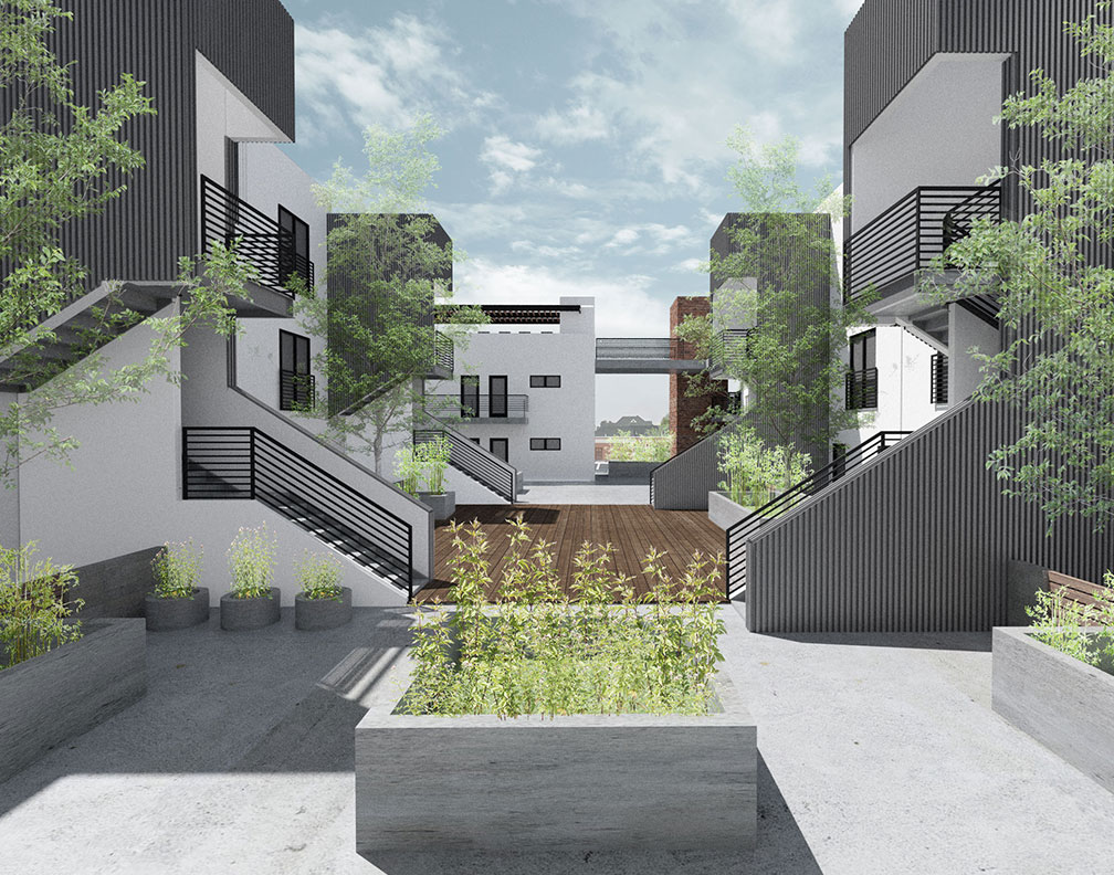The KalThom Multifamily Residence uses the concept of the micro-unit coupled with a mindfulness towards the future of the urban dwelling. A mixture of various flats of differing sizes was designed with contemporary households in mind and all the units maximize the ease and comfort of living while using minimal square footage. The units are grouped in townhouses of five, surrounding the private communal courtyard. Each townhouse has two apartments on the ground floor with a private patio, while the two second-floor apartments are accessible by private stair via the courtyard.